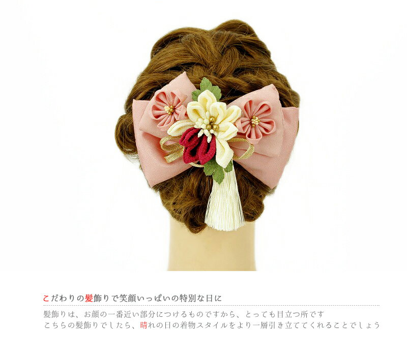 髪飾り 浴衣 夏祭り 花火大会 成人式 振袖 袴 2点セット リボン 花 ピンク 赤 白 金色 ちりめん つまみ細工 組紐 房付き ヘアアクセ かんざし 簪 ヘッドドレス 卒業式 結婚式 入園式 卒園式 謝恩会 七五三 浴衣 ハンドメイド No.9-3540