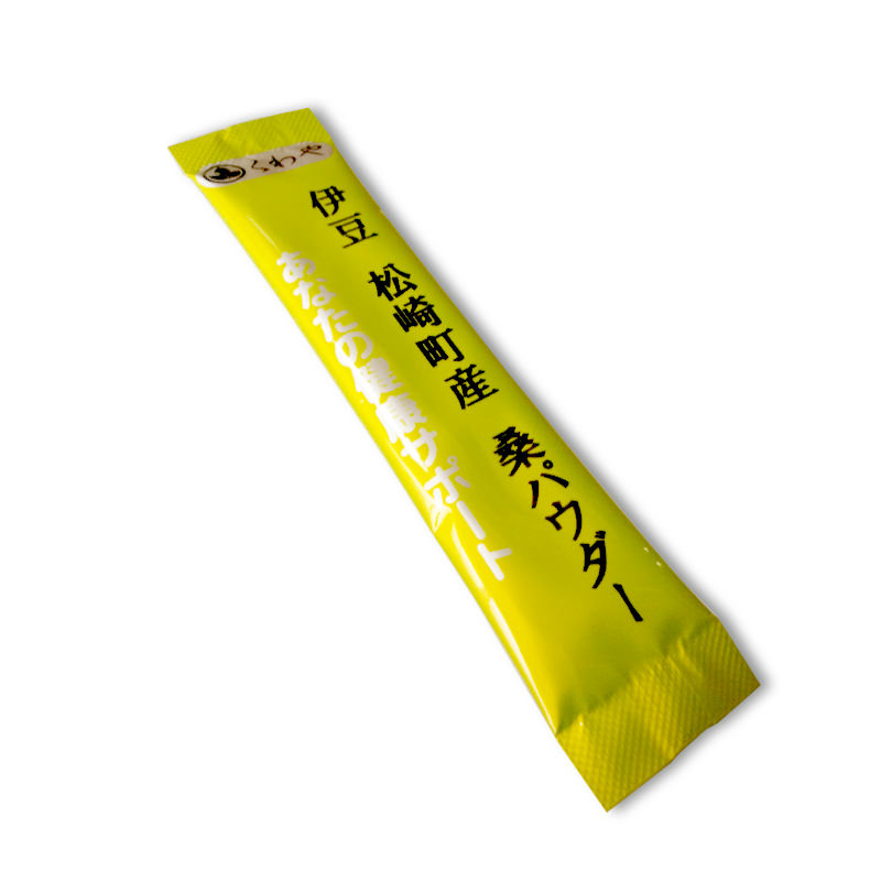 近年、健康増進効果で注目されている桑の葉を栽培期間中、農薬不使用で栽培し、収穫した葉を自社の製茶工場で製造・加工した100%松崎町産の無添加桑葉茶粉末です。