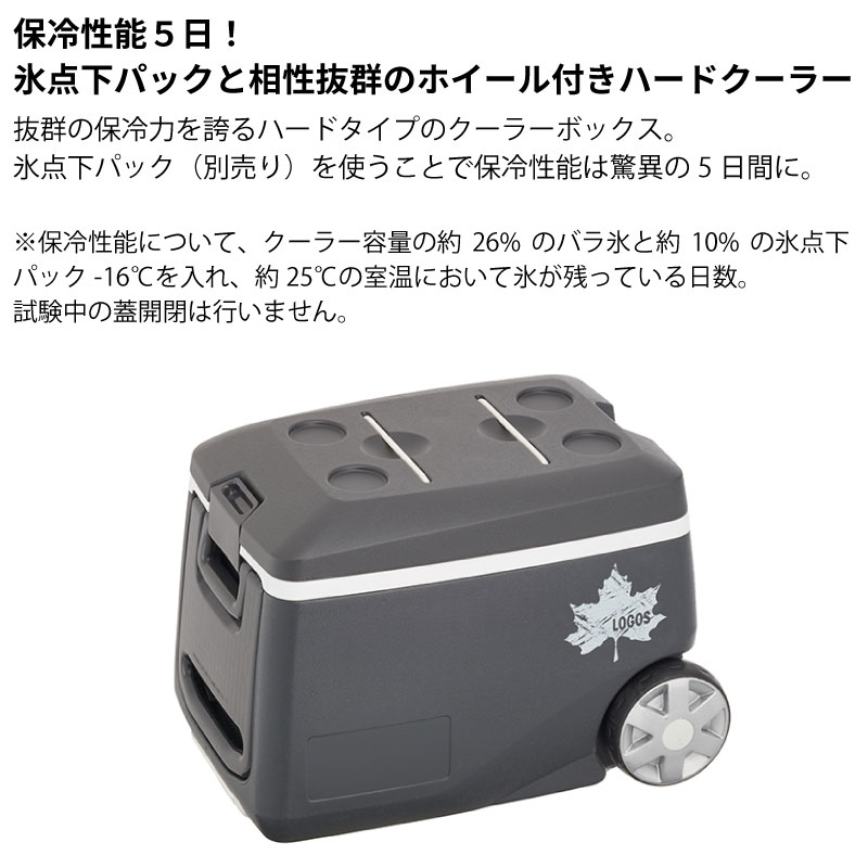 ※保冷性能について、クーラー容量の約26%のバラ氷と約10%の氷点下パック-16℃を入れ、約25℃の室温において氷が残っている日数。