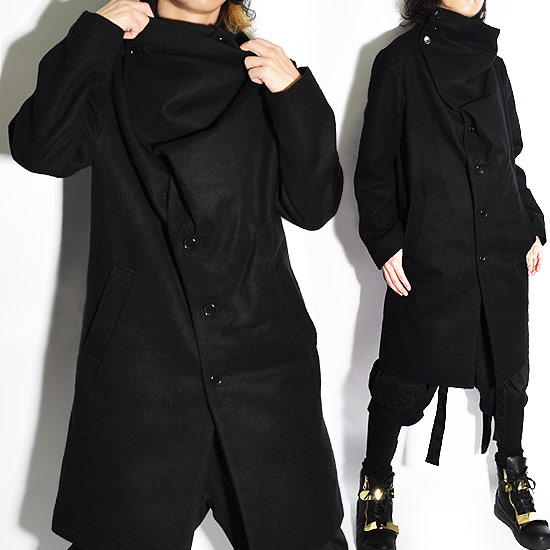 ドレープコート メンズ チェスターコート ロング丈 コート ボリュームネック ハイネック メンズファッション 送料無料 変形 ウールコート ブラック お兄系 V系 ヴィジュアル系 ホスト 大人 2017 秋 冬 新作 個性的 モード系ファッション韓国 衣装 オリジナル ブランド 日本製
