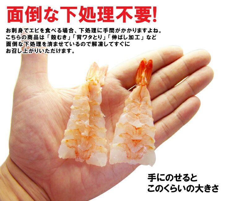 面倒な殻剥き・背ワタ取り・伸ばし加工を全て済ませた下処理済みの生食タイプ。