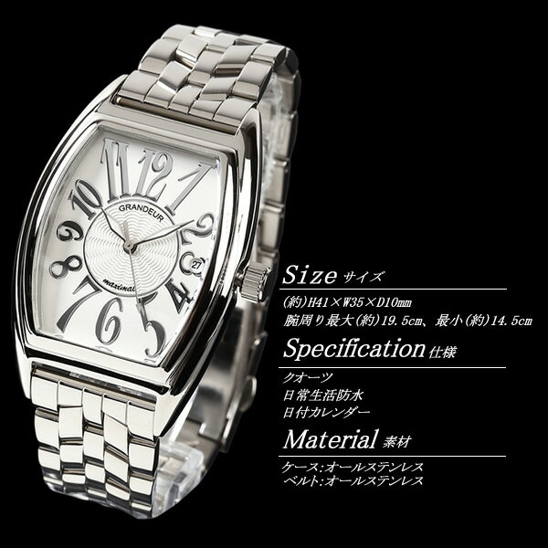 [仕様] クオーツ、 日常生活防水 日付カレンダー[素材] ケース:オールステンレス バンド:オールステンレス[サイズ] ケース:縦(約)41mm×横(約)35mm×厚(約)10mm(ラグ、リューズは除く)、 重量:(約)116g 腕周り:最大(約)19.5cm、最小(約)14.5cm[付属品] 専用BOX取扱説明書保証書GRANDEUR グランドール 腕時計 日本製 メンズ クオーツ 日常生活防水 日付カレンダーJGR001W GRANDEUR(グランドール)は、一つ一つ入念に造られた造形美とテクノロジーの枠を集めた完成度の高い時計です。